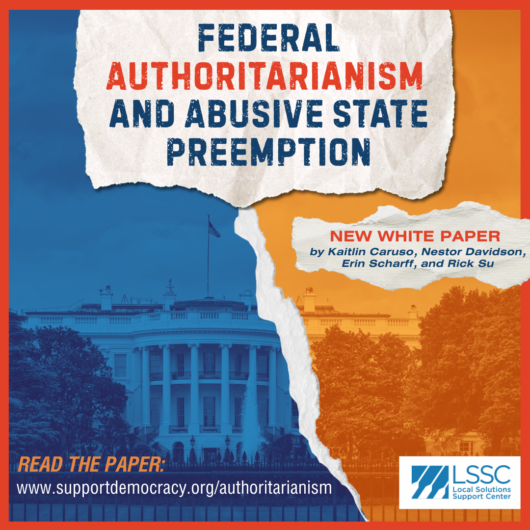 This month, Kaitlin Caruso, Nestor Davidson, Erin Scharff, and Rick Su published a new white paper, “Federal Authoritarianism and Abusive State Preemption” to tell the powerful and timely story of how abusive preemption has paved the way for the rise of federal authoritarianism – and how preemption is now being used to implement that agenda.